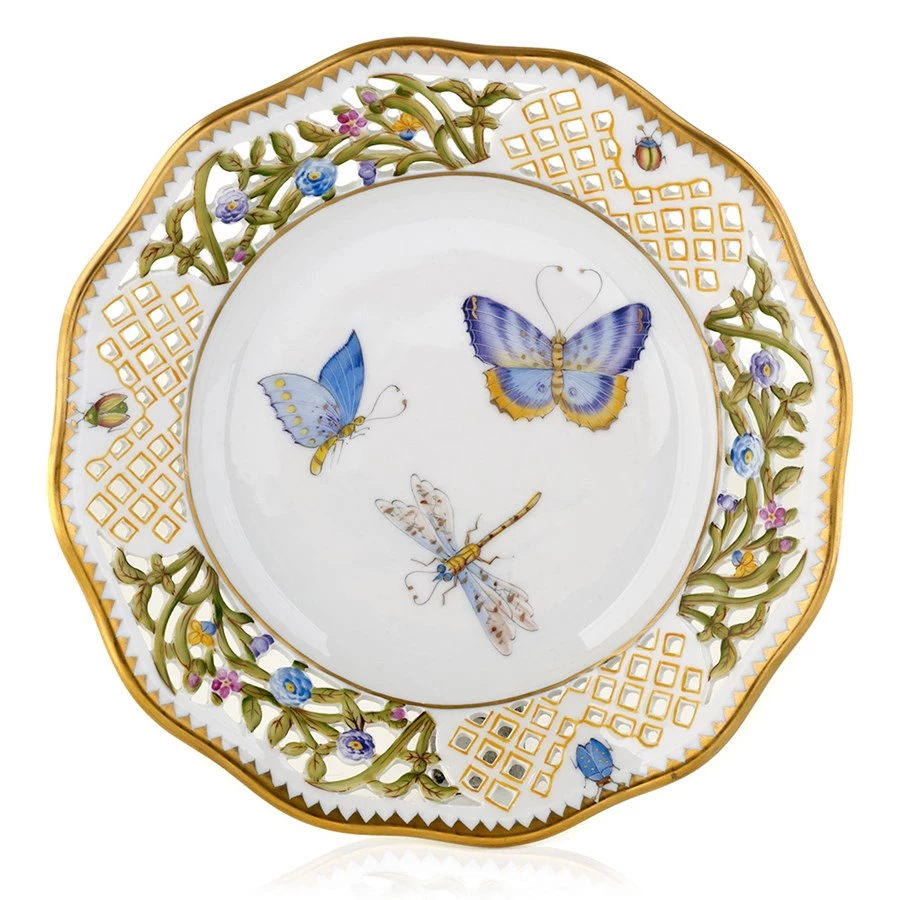Anna Weatherley introduces a stunning lace porcelain collection, highlighting the technical skills of the master ceramicists. Each plate boasts incredible skillful piercing, creating a lacework style lattice, outlined in handpainted lines adding a whimsical charm to the complex procedure. Of course, the handpainted design is quintessential Anna Weatherley, paying home to the artisanal European tradition with butterflies, flowers, and other garden life. Handmade porcelain from Hungary, handpainted with 24k gold accents. Each plate is signed by the artist.