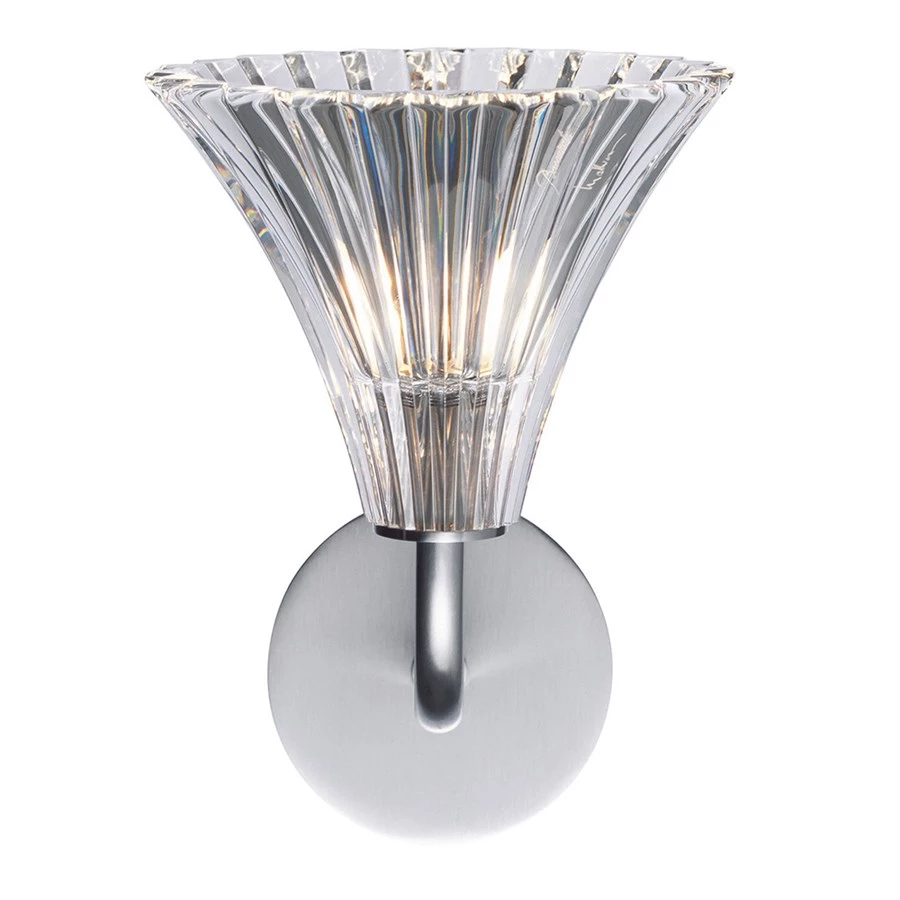 This Mille Nuits Tulip Wall Sconce glimmers whether or not the lamp is illuminated. The flowerbud-like silhouette gradually fans out from the round base. The sconce pivots 180 degrees, directing the glow anywhere between ceiling and floor, with the beveled cuts of the cup enhancing the light-scattering properties all the more. The tulip wall sconce is available in luminous Clear crystal, and Baccarat’s signature red hue. Sold Individually. Particularly effective as a pair.