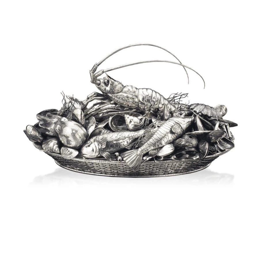 Handcrafted by the finest Buccellati artisans in Milan, this centerpiece is made entirely of sterling silver. A detailed, woven basket holds fish, shellfish, and other sea life for a delicious centerpiece. This timeless tribute to the fruits of the sea is a stunning design fit for any table. Handmade in Italy.