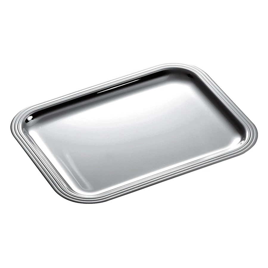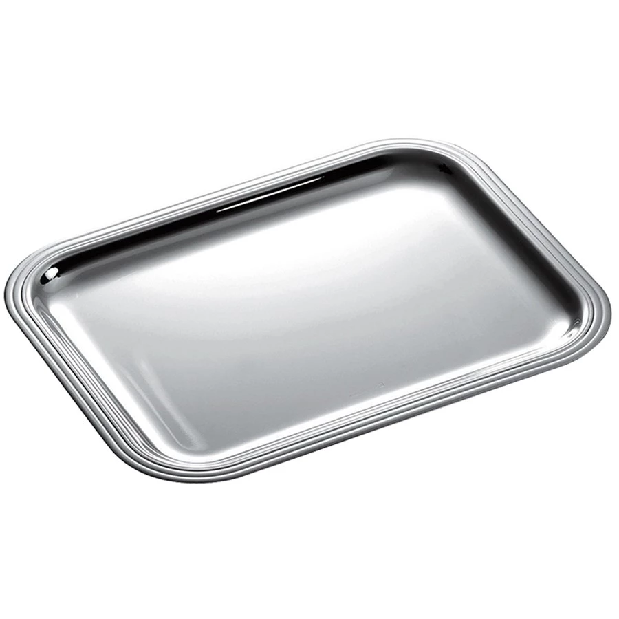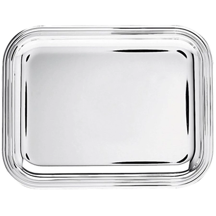 The silverplated rectangular tray in the Albi pattern can be used for presentation or serving. The Albi line, created in 1968, takes its inspiration from a French town located between Toulouse and Bordeaux and its famous cathedral known for its remarkable architecture, clean straight lines, and single nave. From Christofle of France.