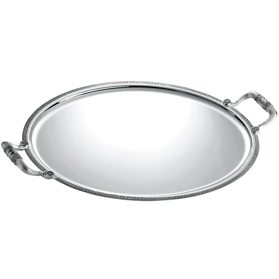This large silver plated oval tray with two handles in the Malmaison pattern is ideal for beverage service or tray-passed appetizers at an event. One of Christofle’s most historic patterns, Malmaison typifies the Empire style, with its frieze of delicate palm and lotus leaves and symmetrical design. The name is a nod to the Chateau de la Malmaison, a favored Parisian residence of Napoleon Bonaparte and Empress Josephine. Malmaison, one of Christofle’s most historic patterns, is in the Empire style. The frieze of delicate palm & lotus leaves is typical of this style.