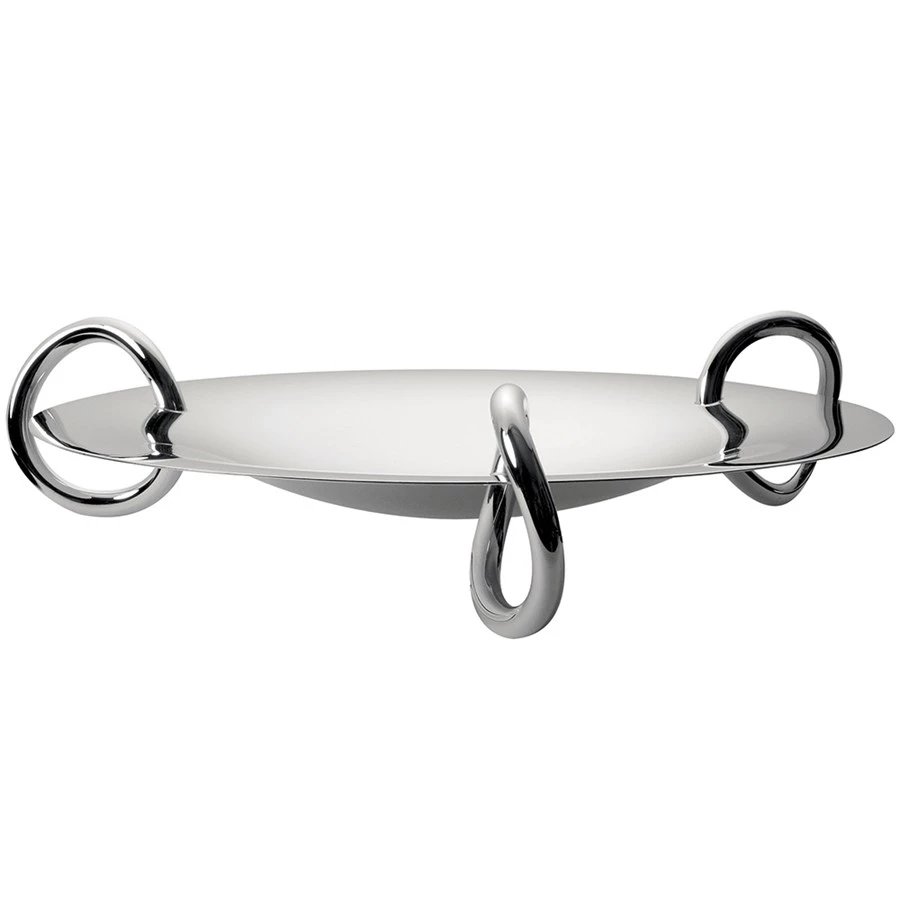 Set a modern yet playfully elegant table with the help of the silver plated Vertigo centerpiece. Use on its own as a table accent or fill with flowers or candles. Vertigo’s bold motif — a subtly asymmetrical, thick ring often placed playfully askew — can be found on every piece in the collection designed by Andrée Putman. Handmade in France.
