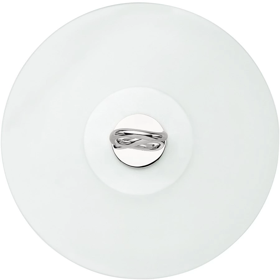 The Vertigo cheese tray in frosted glass with silverplated center detail/handle is the perfect way to add modern elegance to cocktail hour. An ideal way to serve cheese, charcuterie, or finger foods, Vertigo’s bold motif — a subtly asymmetrical, thick ring often placed playfully askew — makes it easy to transport the tray from kitchen to table. Designed by Andrée Putman. From Christofle of France.