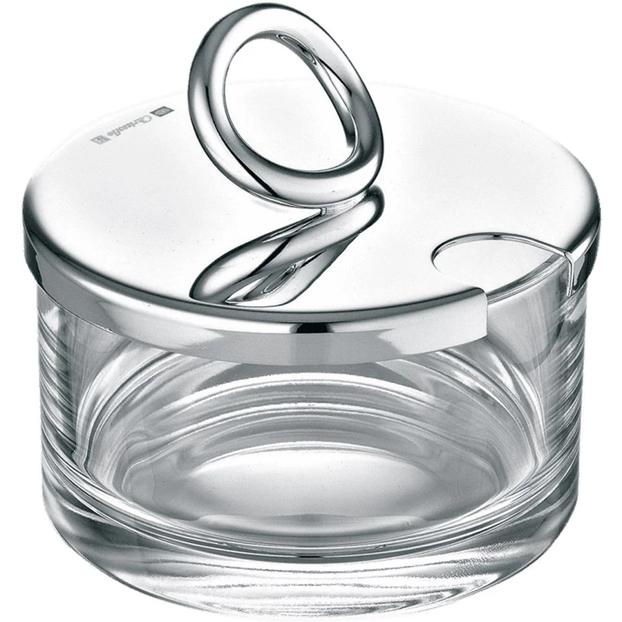 Set a playfully elegant table with the Vertigo Silver Plated Lidded Cheese/Jam Dish. Vertigo’s bold motif, a subtly asymmetrical, thick ring often placed playfully askew, is designed by Andrée Putman. From Christofle of France.