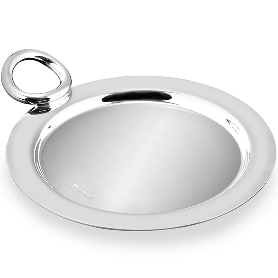 Vertigo features a strong emblem: a ring, whose sensual & subtly asymmetric design is found on every piece. This particular piece can serve as both a bottle coaster & as a bread plate. Made of fine Christofle silver in France.