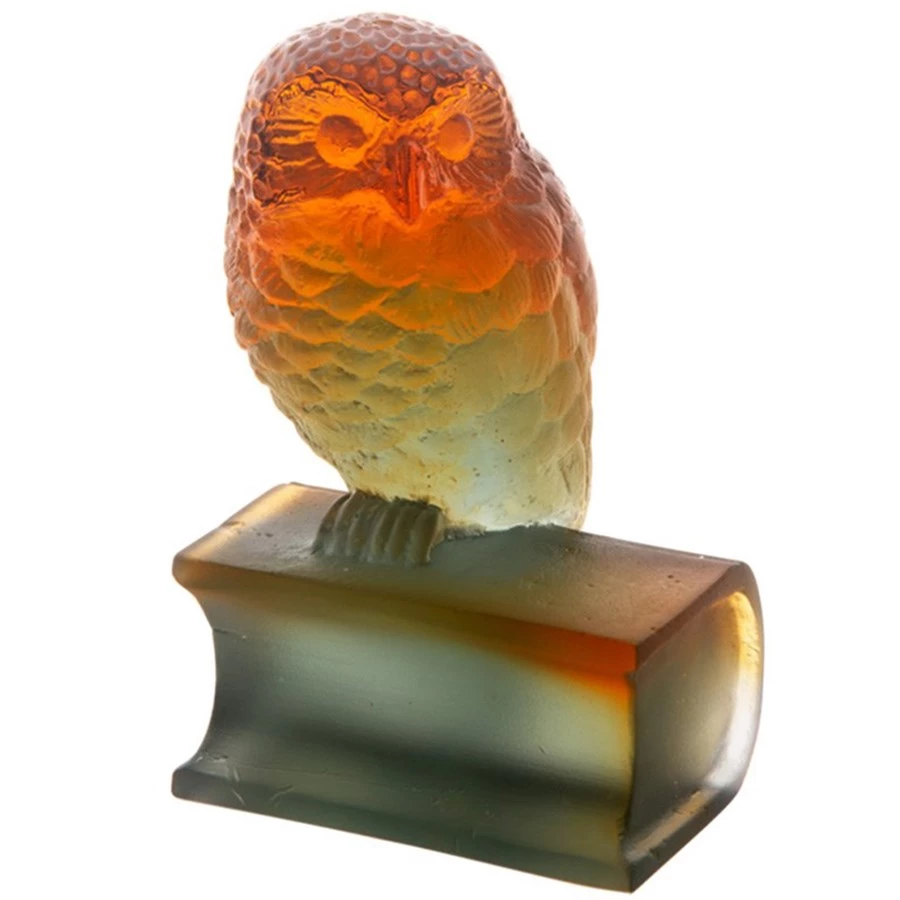 A wise owl sits eloquently atop a large tome. The rare and ancient “Pâte de Verre” glassmaking technique, which dates back to 5,000 BC, involves melting many fragments of colored crystal within a mold. This results in intense colors and subtle shading. Handmade in France.