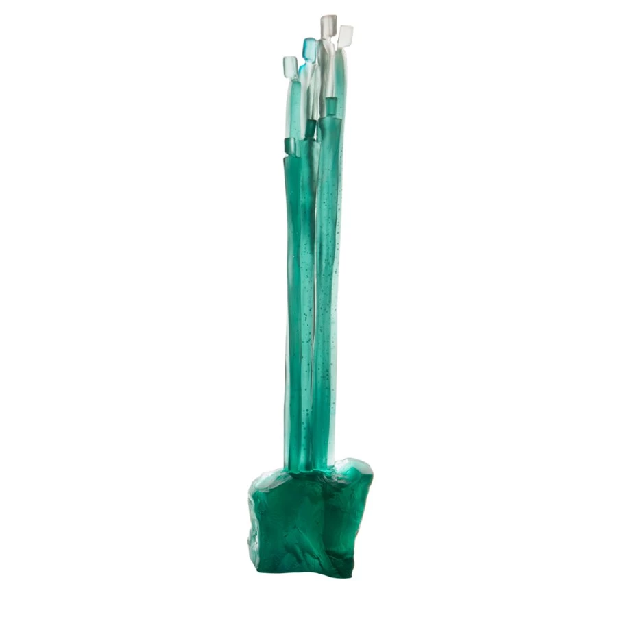 Daum collaborated with Laurence Bonnel to create stunning architectural silhouettes. Almost primitive, human motifs erupt with a burst of energy from the crystal earth. The technique employed to create this piece is the rare “Pâte de Verre” glassmaking method, which dates back to 5,000 BC. It involves melting many fragments of colored crystal within a mold, resulting in intense colors against a subtly shaded background. Handmade in France.