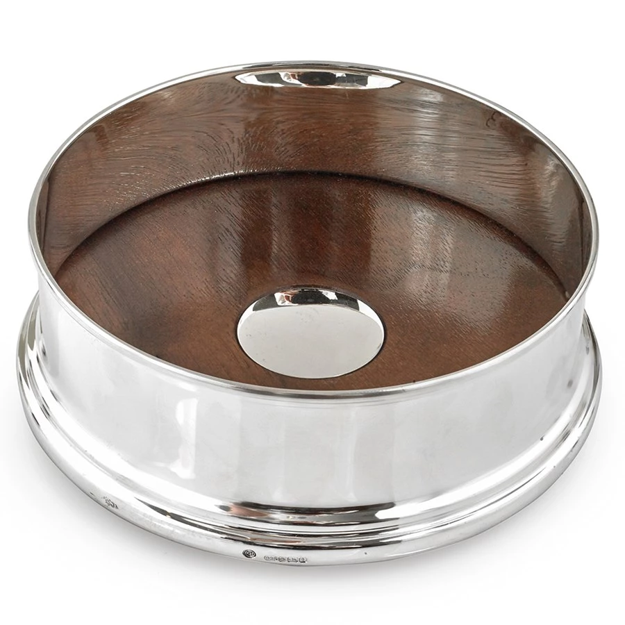 The Sterling Silver Plain Coaster, Large is handmade in England, with classic clean design that complements any home or office. Hallmarked sterling silver with a finished rich walnut wood interior. Handmade in England. Exclusively at Scully & Scully. For a one-of-a-kind gift have your medallion in center engraved with a monogram or special date. Three initials or classic monogram (last initial larger and in center) $24. Please allow one week for engraving.Â