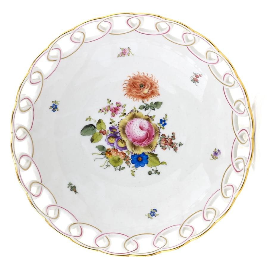 Richly detailed and hued flowers adorn the interior of this elegant porcelain basket. The rim is elevated with openwork, decorated with 24k gold embellishments interlaced with pink. Suitable as a fruit bowl or centerpiece in its own right. Handmade and handpainted in Hungary.