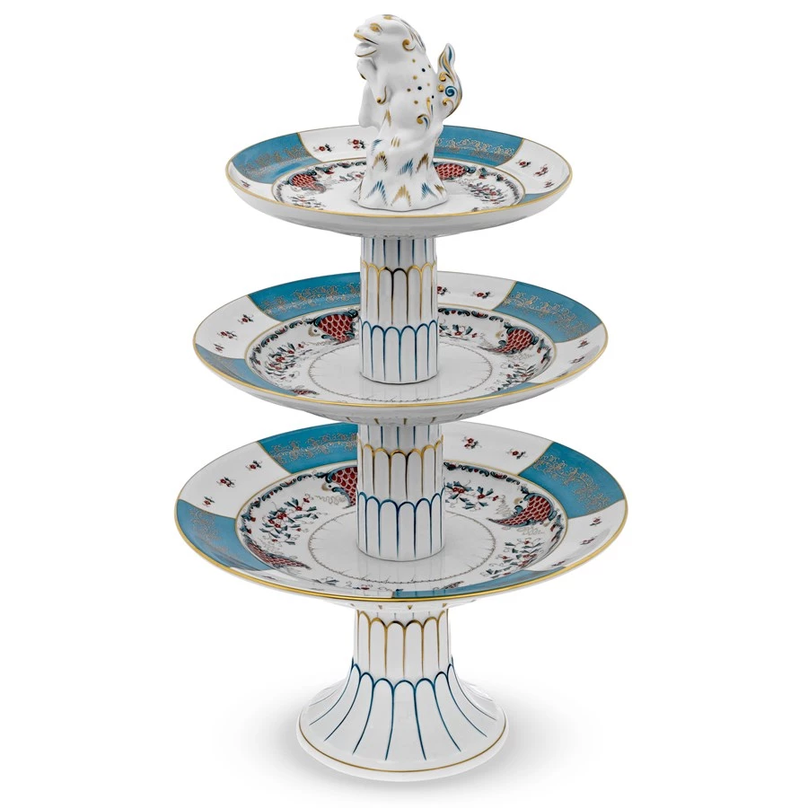 One of the world’s most intricate and elaborate examples of hand painting on porcelain, this luxurious pattern was created in the 1870s for the Shah of Persia. Its rich use of gold is layered over lush turquoise and pomegranate shades on a pure white field. Handmade and painted in Hungary.