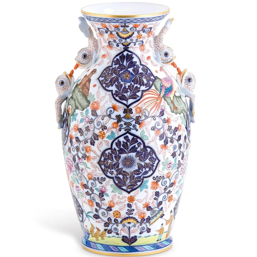 Exquisite handmade porcelain is handpainted with the elaborate Imari pattern, rich with cobalt blue, and accented with handpainted 24k gold. Among the intricate motif, one can find turquoise green leafs, red peonies, and hand-enameled phoenixes. Handpainted with intricate flower designs, its handles are swimming dolphins spitting water. Handmade and handpainted porcelain from Hungary with 24k gold accents.