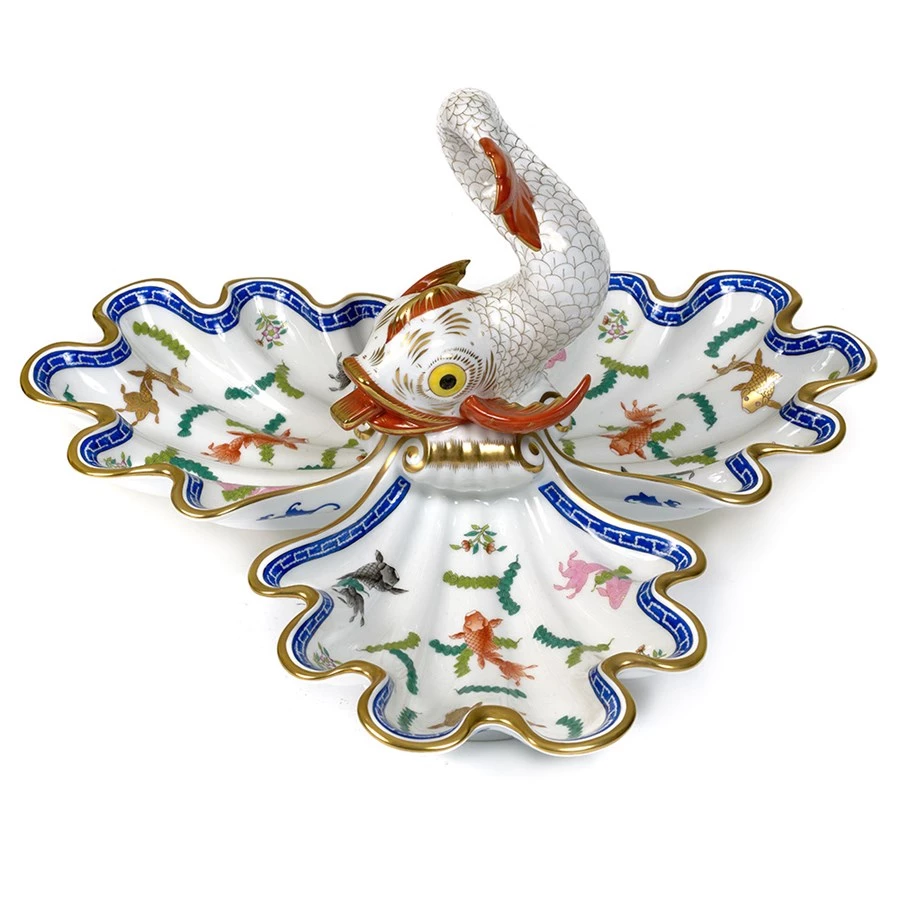 Handmade handpainted porcelain from Hungary, in the fascinating Poisson pattern introduced by Herend in 1855 in Paris. In Chinese symbolism, the combination of fish and seaweed represents longevity. Exclusively at Scully & Scully.