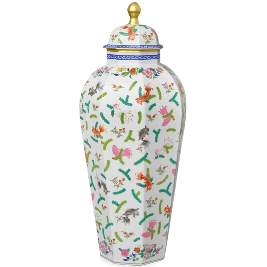 The Poisson décor was born as a richly executed revival of a museum piece. Ornamental carps, sedges, and foliated scrolls representing wealth are popular elements of Chinese porcelain decoration. Handmade and hand-painted in Hungary with 24k gold accents. Limited edition.