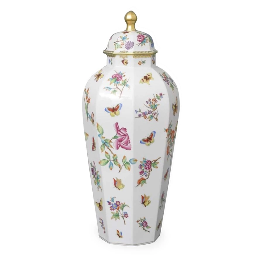 The classic Queen Victoria pattern is transformed from special dinnerware into a spectacular ornate vase with a button knob lid. Handmade and handpainted porcelain from Hungary with 24k gold accents.