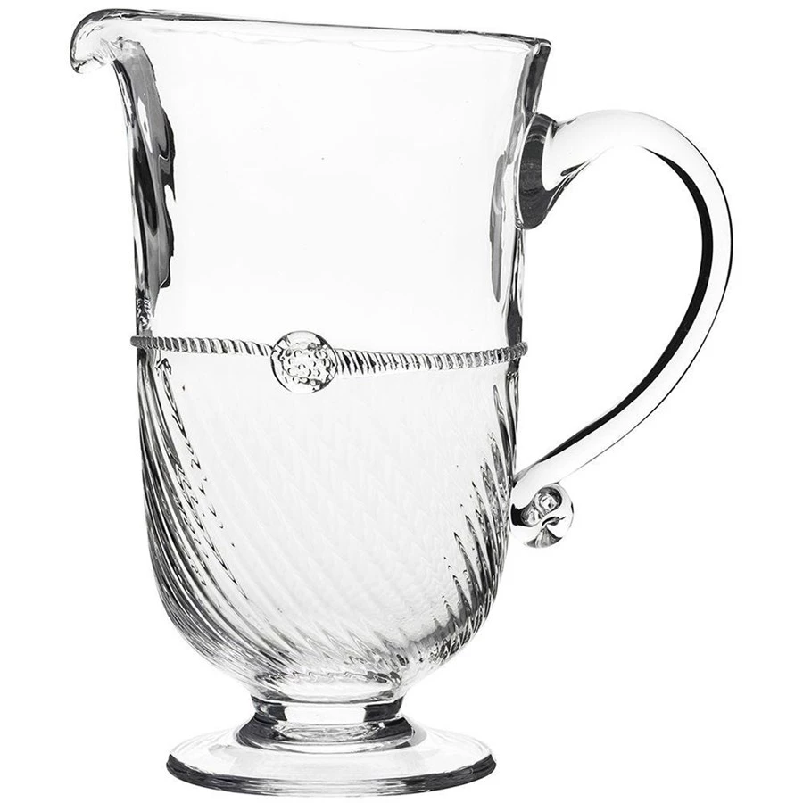 Crowned with a simple thread and single berry, dressed in optic glass from the waist down and belted with a charming sash this large pitcher is a supreme vessel for iced tea, sparkling water or pink lemonade.