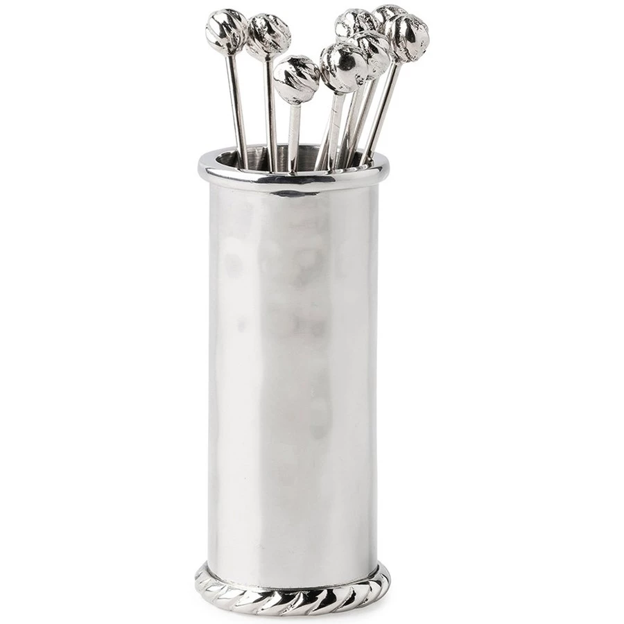 Decorated with a tidy trimming of simple thread, each piece in the Juliska Graham barware collection is handmade in hammered stainless steel and polished to brilliance. This set of eight cocktail picks with accompanying holder works wonderfully for skewering a maraschino cherry or olive for your favorite craft cocktail. Each pick is adorned with a decorative finial.
