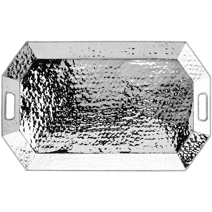 Decorated with a tidy trimming of simple thread, each piece in the Juliska Graham barware collection is handmade in hammered stainless steel and polished to brilliance. This spectacular tray is ideal to set atop an oversized ottoman or coffee table and corral coffee table books, glasses or decorative objects. The tray includes sloping sides and two handles for easy carrying. Stand not included.