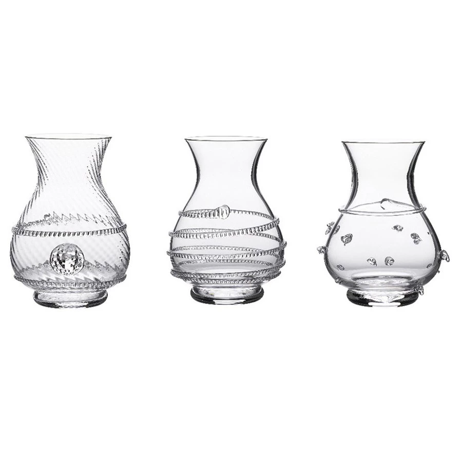Three of Juliska’s most popular patterns are rendered here in a set of three elegant and highly-giftable vases. Just the right size for a flower or two, the set comes pre-boxed for chic and easy gift-giving for others, or yourself. Bohemian mouth-blown glass from the Czech Republic.