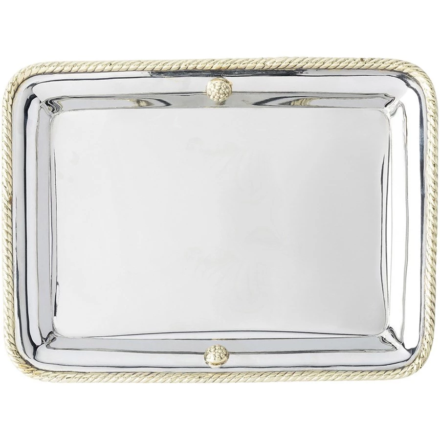 Sculpturally accented with iconic berries and threads in lustrous brass, the Periton collection from Juliska is handmade in stainless steel and polished to brilliance with brass accents. This rectangular tray makes a generous presentation for serving cocktails or corralling decorative objects.