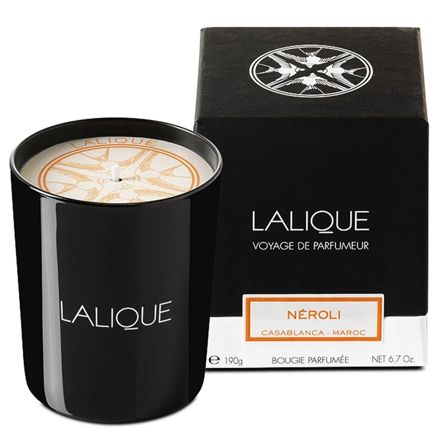 Part of the Voyage de Parfumeur collection, a Lalique candle is an opulent treasure that fills a room with a complex scent designed by master perfumers. The white wax candle is scented with Neroli, inspired by the fabulous Moroccan city of Casablanca. The fragrance opens on a clear and bright Bitter Orange and Mandarin accord, blended with the warmth of Ylang-ylang. The addictive Neroli essence blooms in the heart in a heady bouquet of Orange Blossom and Jasmine Sambac, to later unfold into a voluptuous base of Vanilla, Amber and Patchouli notes. The wax is presented in a stylish black lacquered glass tumbler. Handcrafted in France.