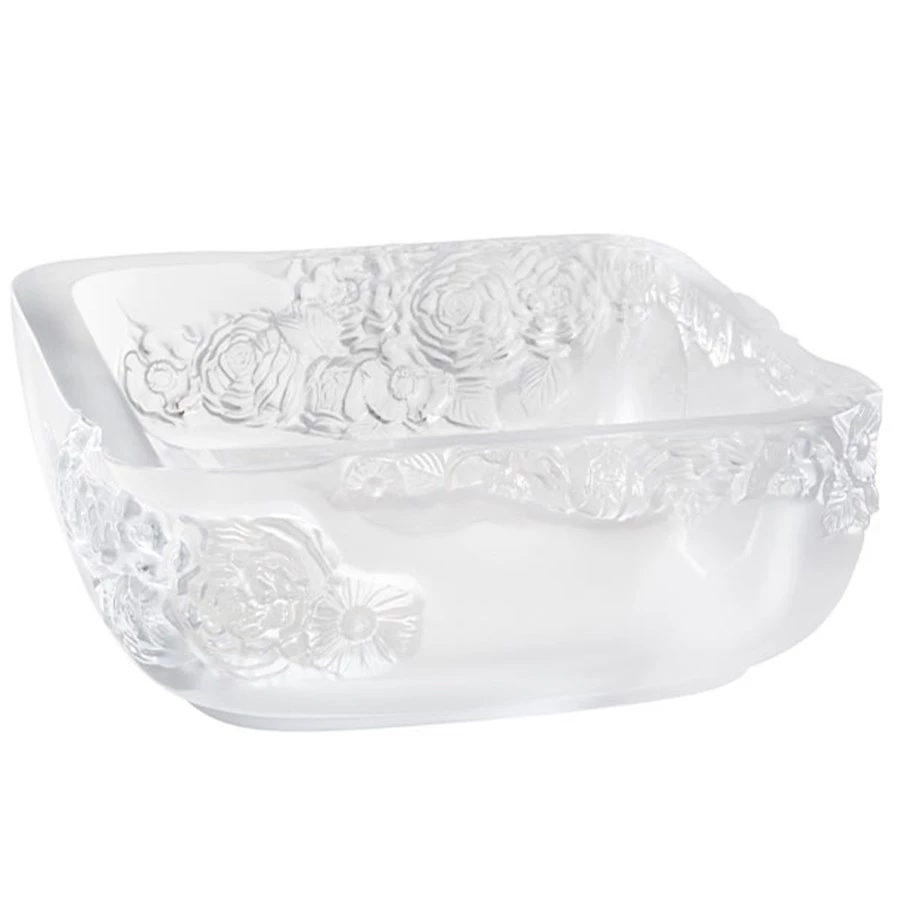 Alliance of brute strength and delicacy, juxtaposition of square shape to the curved lines of the sculpted motifs, the Pivoines vases and bowl embody a contrast of mineral strength and floral romanticism. Symbol of prosperity, beauty and honour, the peony is an emblematic flower, especially in China where it is often depicted. As if carved in the gouge of a rock garlands of flowers take possession of crystal, like luxuriant nature takes its rightful place over abandoned constructions. Their modelling also evokes the process of Lost Wax sculpture, when the craftsman breaks the plaster mould to reveal the piece. Handmade in France.