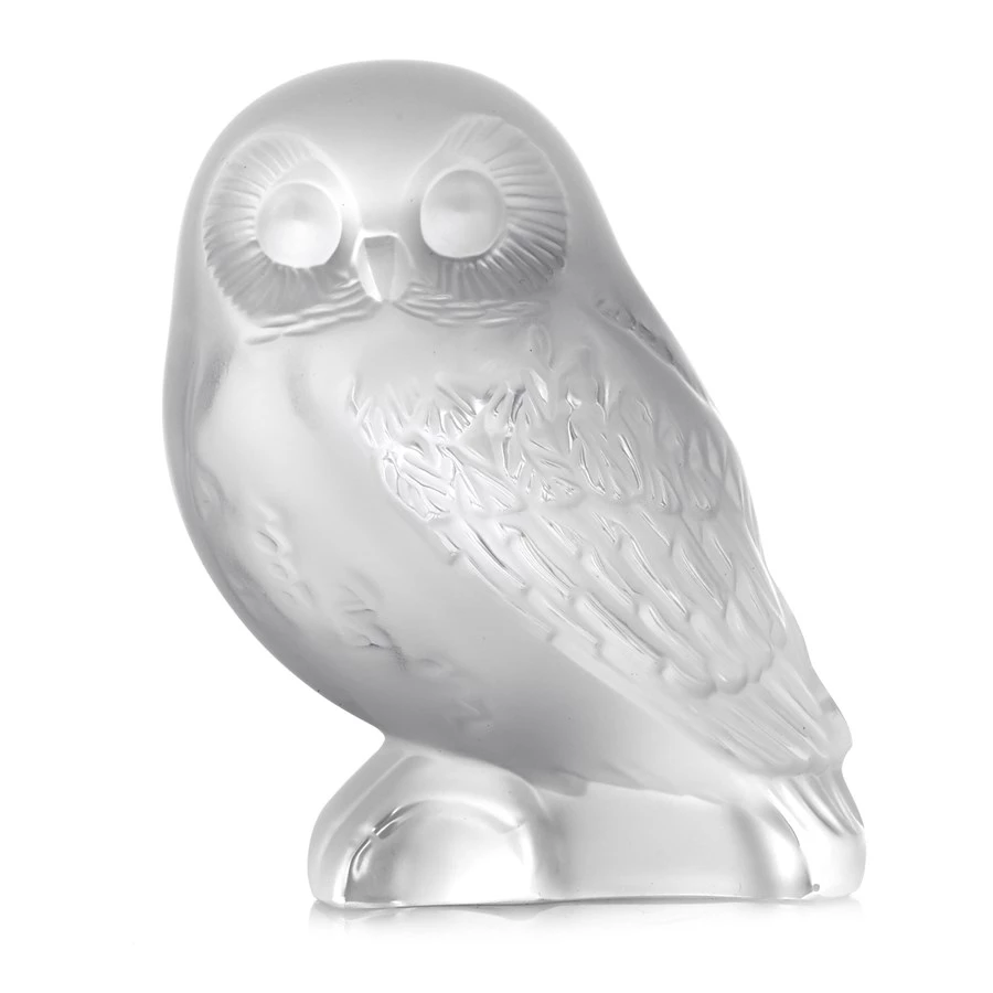 Companion of wizards and symbol of wisdom, this night hunter inspires both fear and fascination. Nobly perched with eyes wide open, the Shiver Owl watches over the world. Handcarved and handfinished crystal from Lalique of France.