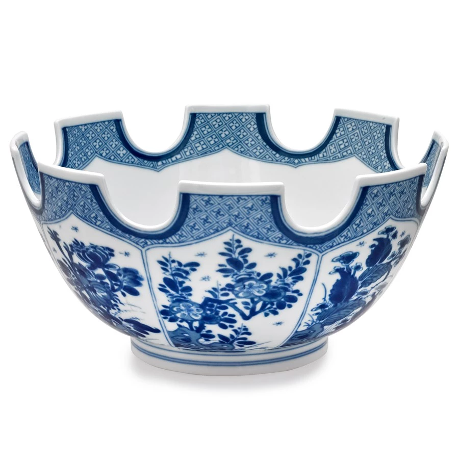 A reproduction of a Metropolitan Museum of Art original, this unusual shape was one designed to hold wine glasses but today functions as a decorative accessory or punch bowl. Handmade of fine porcelain by master artisans in Portugal.