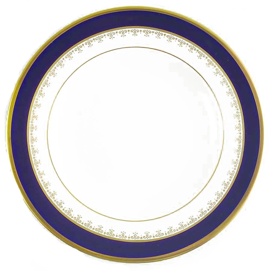 Ivory porcelain is adorned with a rich cobalt band and 24k gold filligree and framing. A timeless dinnerservice inspired by President Washington. Made in America.