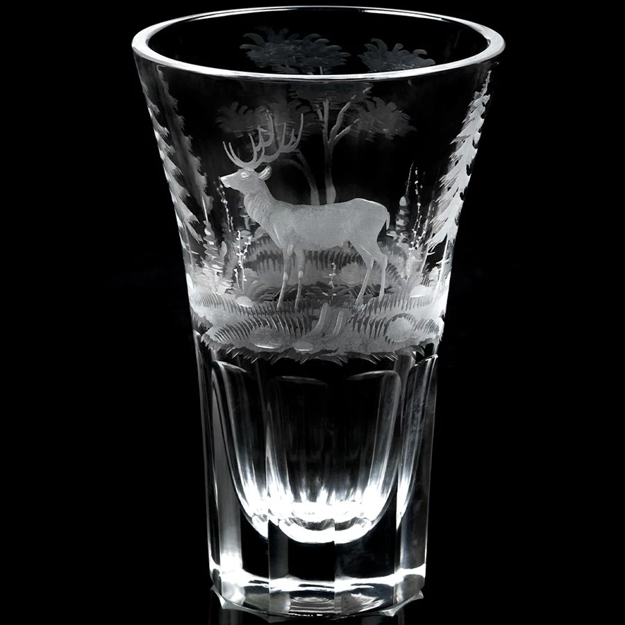 This stunning crystal vase from Queen Lace is mouth-blown before being carefully hand-engraved with an elegant stag among a forest landscape. The handpolished vase is painstakingly engraved using the rare copper-wheel technique developed during the Renaissance. A single engraving takes more than 24 hours to complete, with the craftsman holding the vase the entire time it is engraved. Handmade in Germany.Â