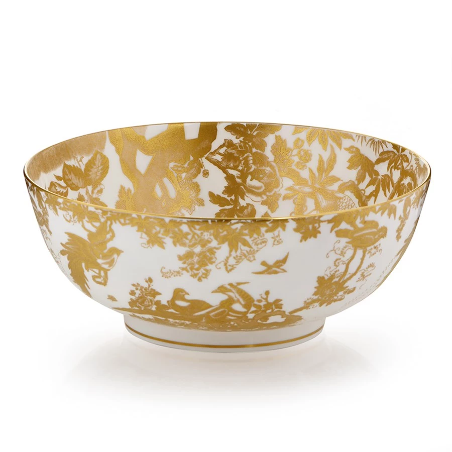 Showcasing design excellence through lavish hand decorated 22 karat gold, the exceptionally popular Aves pattern is given a timeless opulance. Adapted from an embroidery pattern by painter, Albert Gregory, it is elegantly designed to be a statement pattern, adorned with dramatic birds of paradise and peacocks. The original Avesbury pattern has appeared on Royal Crown Derby’s luxury tableware since 1932. Handmade in England.