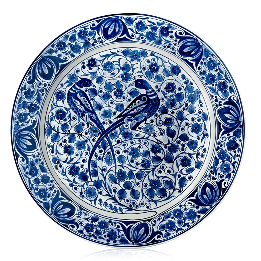 The timeless blue and white colors of Delft are used here to create a decorative plate with two fabulous peacocks seamlessly integrated into the beautiful flower and leaf motif. Entirely handpainted in Holland in the same workshop in production since the 17th century. Exclusively at Scully & Scully.