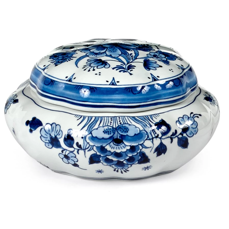 Classic blue and white color palettes with flower and leaf motifs. Entirely handpainted in Holland in the same workshop in production since the 17th century. Exclusively at Scully & Scully.