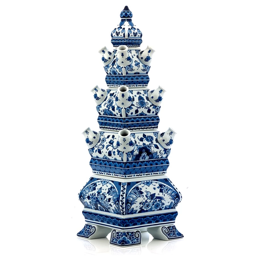 This beautiful blue and white vase Tulipiere consists of a stack of ever smaller elements. Flowers can be put in each opening. The imposing flower pyramids are made to follow the late 17th century royal pyramids. Over 300 years after the first vases were developed in Delft the blue and white flower pyramid remains a famous national icon with royal allure. Entirely handpainted in Holland in the same workshop in production since the 17th century. Exclusively at Scully & Scully.
