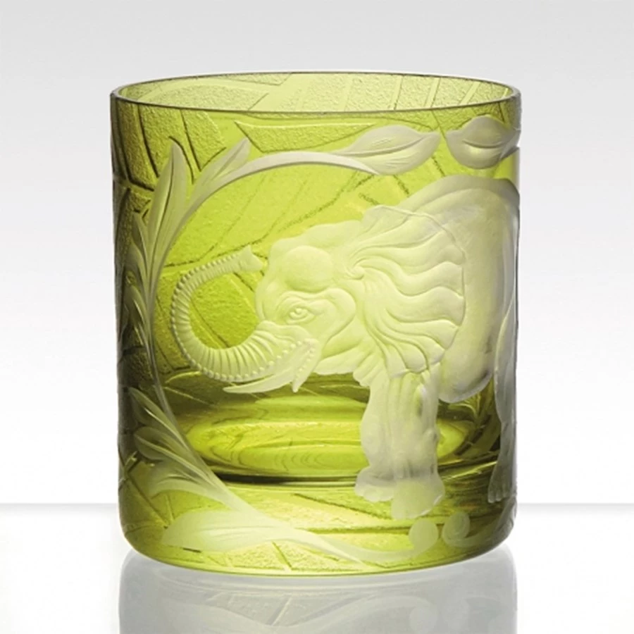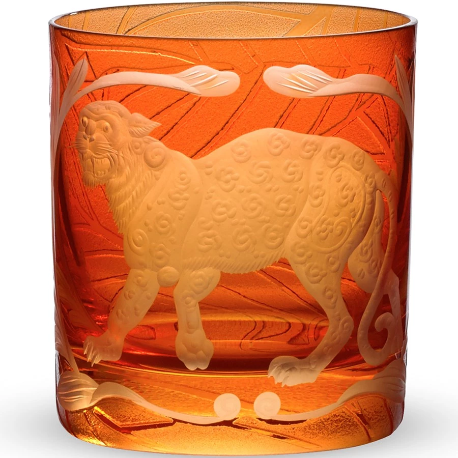 Inspired by a wide range of classical and modern sources, including jungle flora, baroque furniture, Edward Topsell’s 1658 book The History of Four-footed Beasts and Serpents, and Miuccia Prada’s fashion collection, Jungle Baroque represents a bold new direction from Artel, while maintaining an ongoing commitment to meticulously handcrafted production methods. After being mouth-blown by master craftsmen, each piece is sandblasted with a lush jungle-leaf design, hand-colored, kiln-fired, and then hand-engraved with a jungle animal figure in an ornate baroque-style frame. This multi-step process results in a truly unique object that is rich with detail and appeals equally to traditional and modern design sensibilities. Comprised of six different jungle animal-themed variations, Jungle Baroque is a beautiful addition to any home décor – from the savannah to the suburbs to the “urban jungle” of the city. The Double Old Fashioned is perhaps the most versatile glass in any barware set, it is perfect for whiskey or any other on-the-rocks beverage.