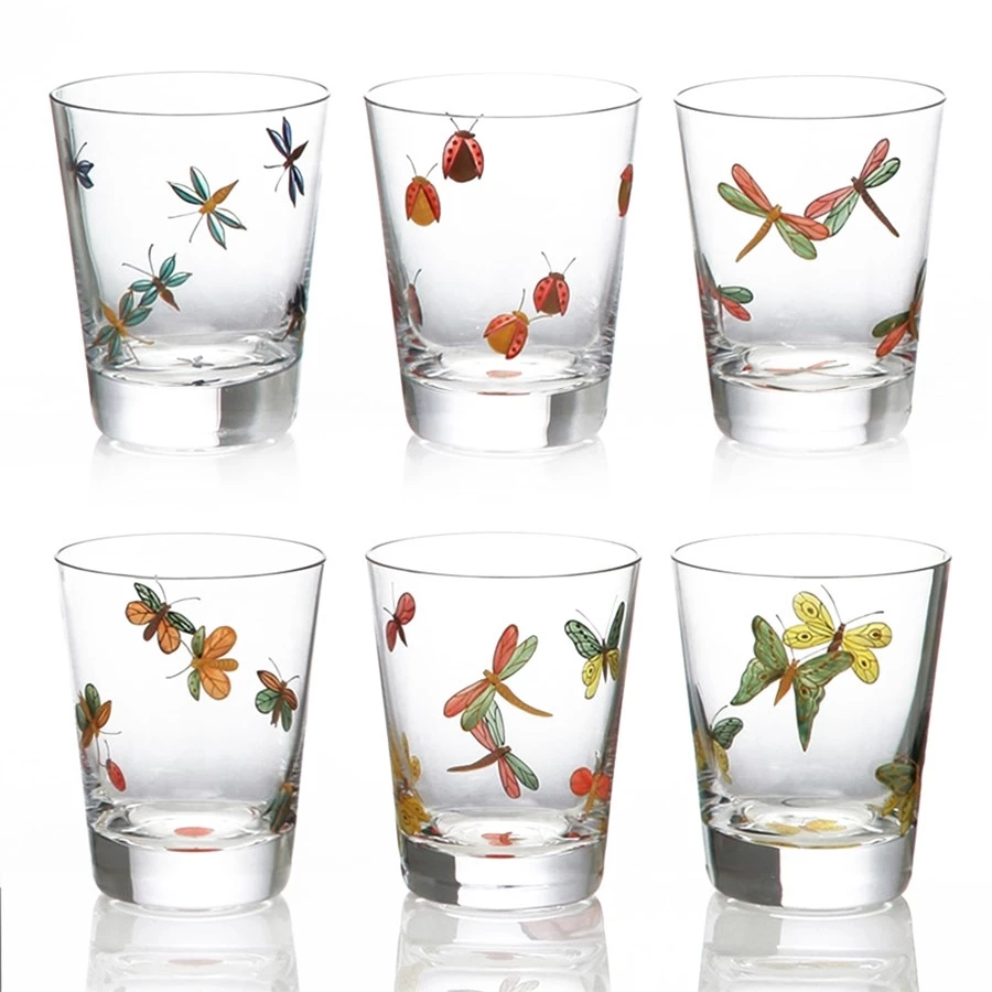 Inspired by artfully detailed botanical drawings from the 1700s, this flying insect motif from Artel features faithfully rendered butterflies, dragonflies, flies, mayflies, wasps dancing across clear crystal. Their bodies are meticulously hand-gilded and hand-painted using a painstaking process that takes days to complete, since each color requires a specific temperature and a different day for firing. Designed for savoring whiskey and other spirits, the Single Old Fashioned features a substantial bottom. Mouthblown lead-free crystal from the Czech Republic.Â