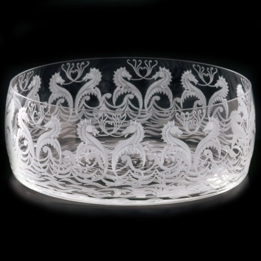 Inspired by the textile patterns of English designer Charles Francis Annesley Voysey, a stately procession of handsome seahorses grace the sides of the crystal with this motif from Artel. The unique shape of the Kirschner Bowl makes it perfect for use as either a centerpiece or serving bowl for salads, fruits, or desserts. Elegant yet fun, special lead-free crystal from the Czech Republic, mouthblown and hand-engraved with diamond and stone wheels.