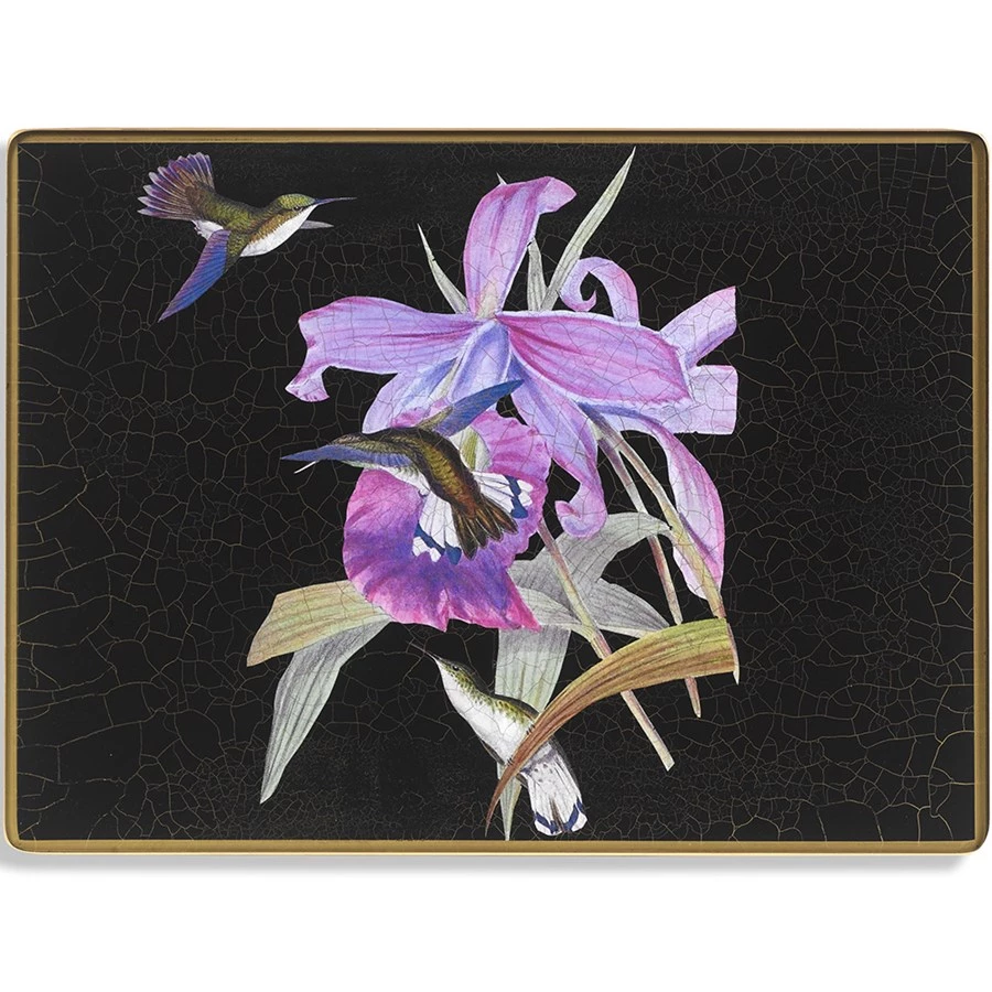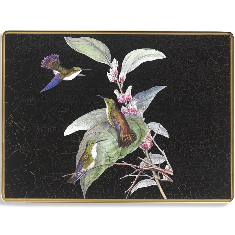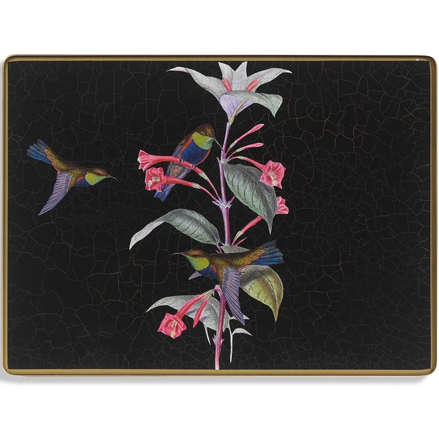 The traditional art of decoupage on glass placemats applies beautifully detailed hummingbird illustrations over black with dramatic gold crackling. Each placemat is then coated with protective and heat-resistant glass with protective felt backing. Mats can hold warm plates. Handmade in England. Exclusively at Scully & Scully.Â