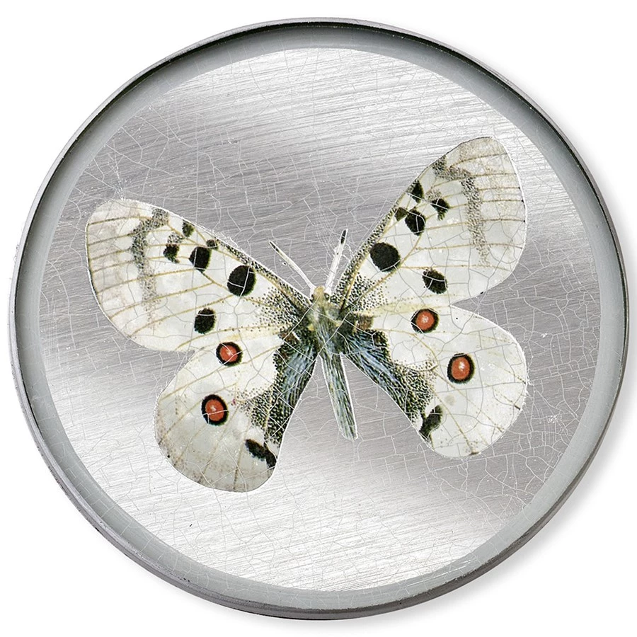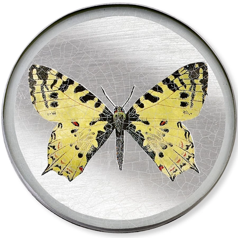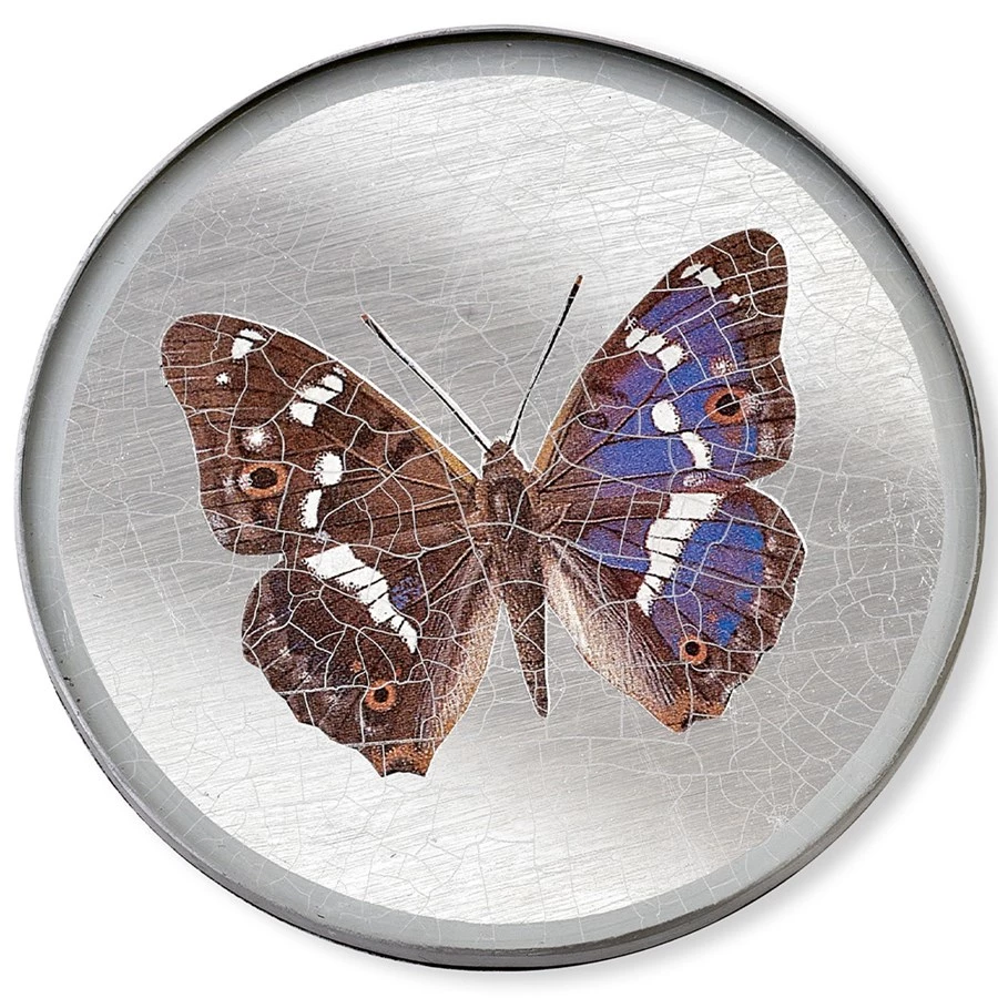 The traditional art of decoupage applies beautiful butterflies against silver on round coasters handmade with heat-resistant glass and protective felt backing. Made in England. Exclusively at Scully & Scully.