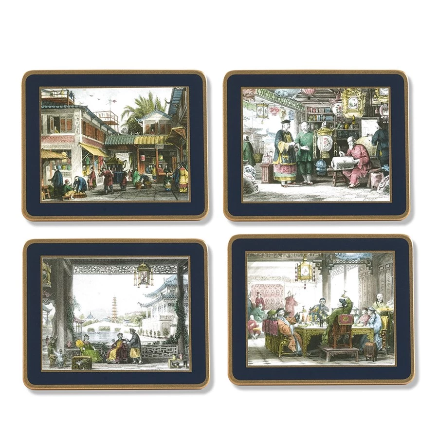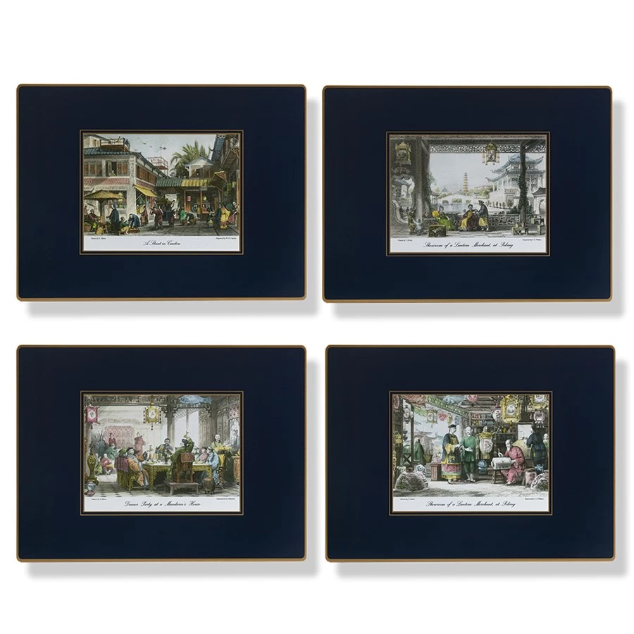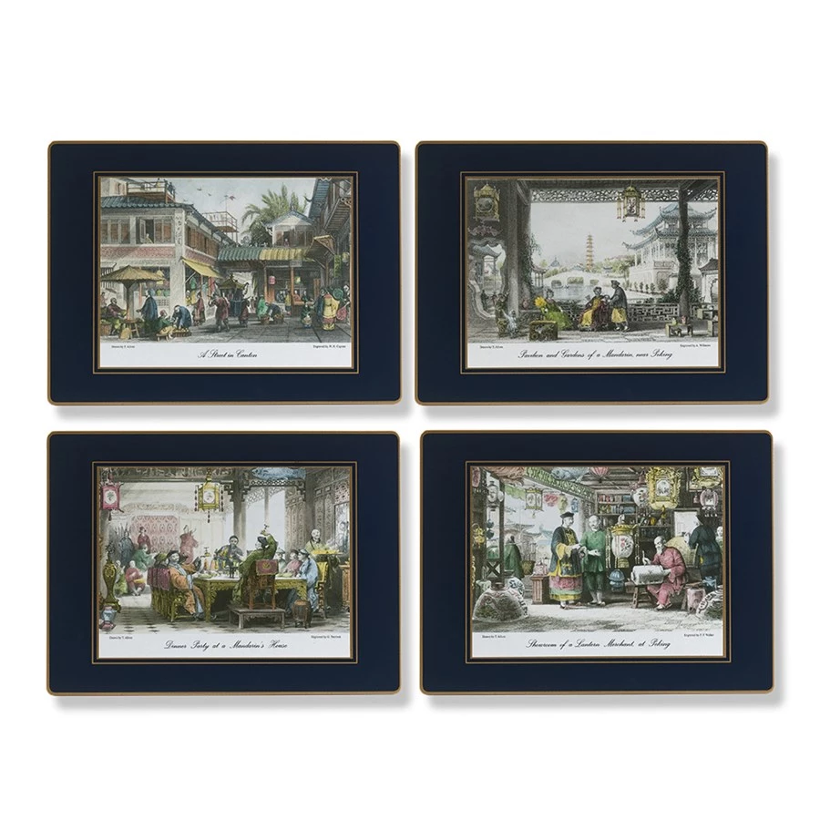 Art prints of original engravings by G. Paterson painted by Thomas Allom in the 1800s are hand-applied to these mats. Lacquered, hand-gilded edges, heat-resistant and felt-backed. Clean with moist cloth. Each come as a set of four. Made in England. Exclusively at Scully & Scully.