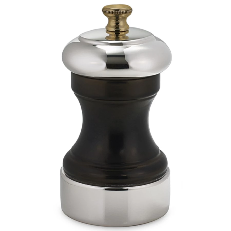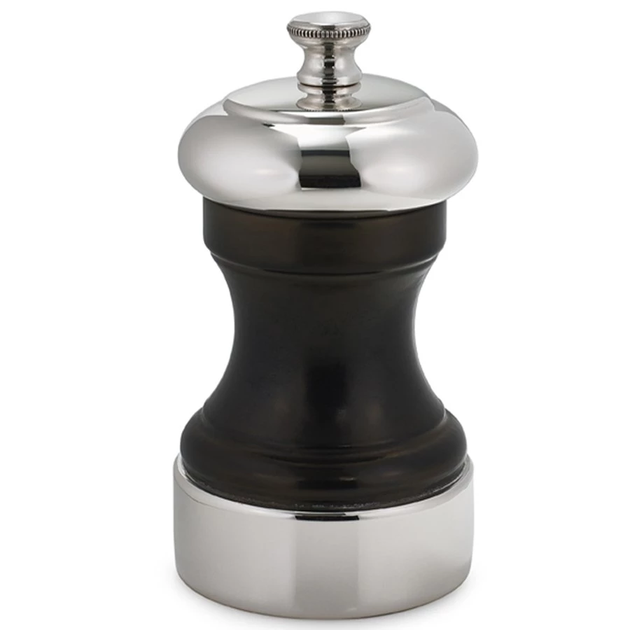 This contemporary set of salt and pepper mills is handcrafted of hallmarked sterling silver and handcarved American Black Walnut. A stunning addition to any kitchen counter or dining table, the world-class Peugeot mechanisms ensure the optimum grind. The generously thick silver has a beautiful mirror finish. The salt finial is finished in gold gilt to distinguish it from the sterling silver finial on the pepper mill. Handmade in England. Exclusively at Scully & Scully.
