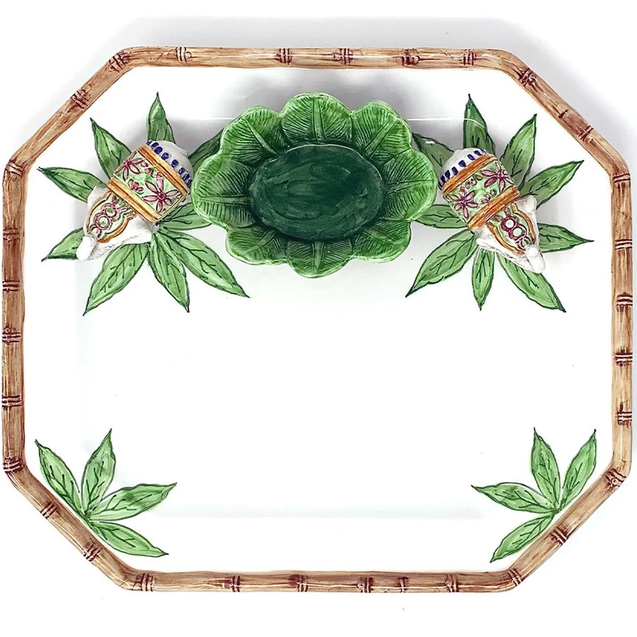 The perfect hostess gift or to have on hand to serve guests in style. Handpainted in Italy. Features two ceramic ceremonial elephants and a faux bamboo design around the border. Made in Italy.