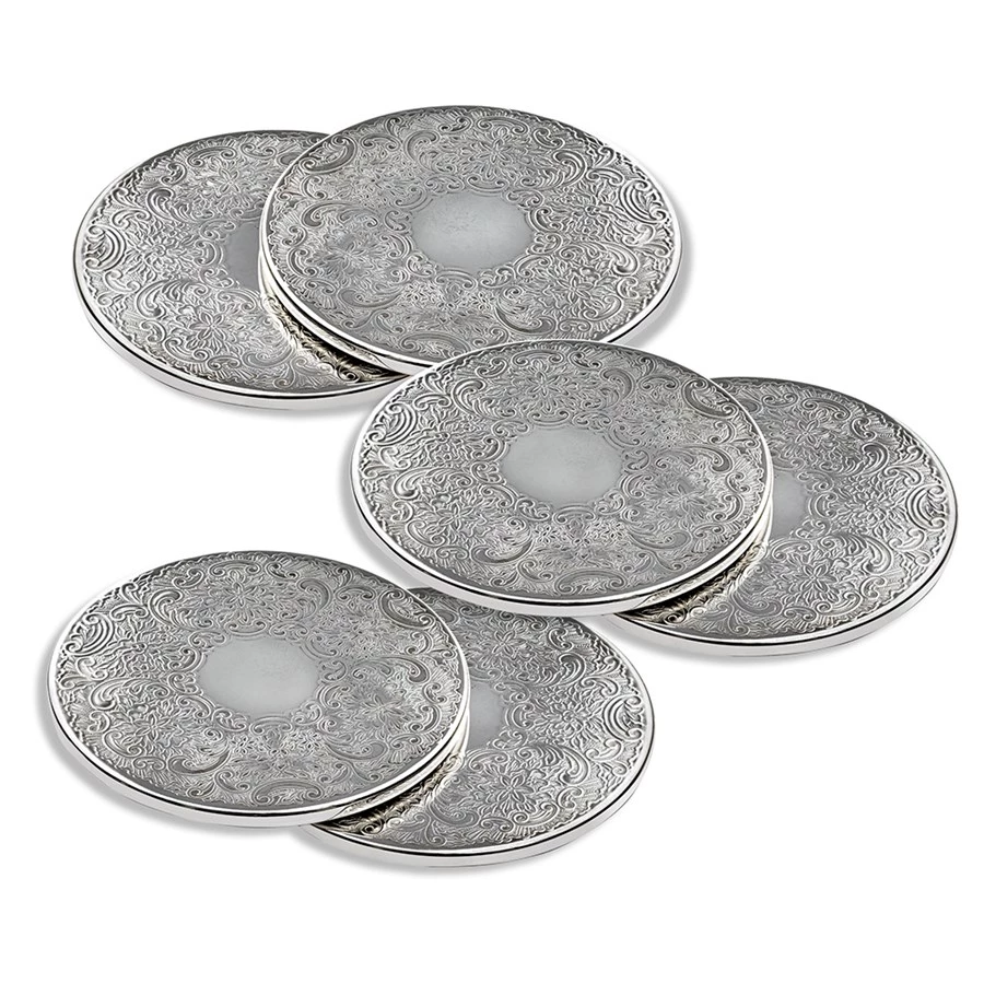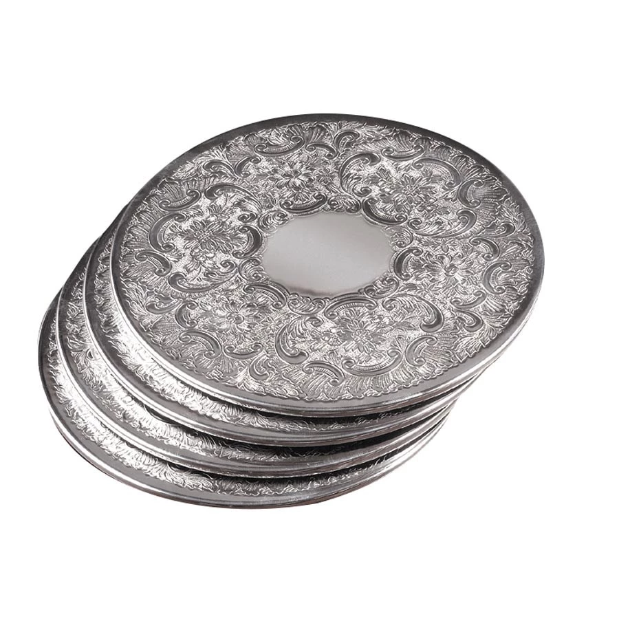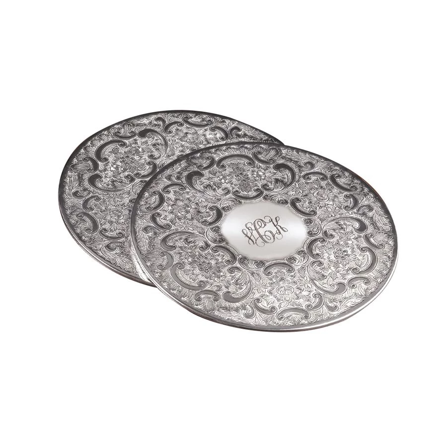 Handmade in England, these pretty mats and coasters are silverplated. Ornately embossed borders surround the smooth center medallion. All are backed in velvet. Medallion in center can be engraved. Three initials the same size or classic monogram (last initial larger and in center) $24. Please allow one week for engraving.