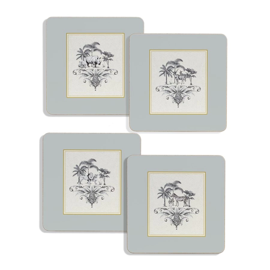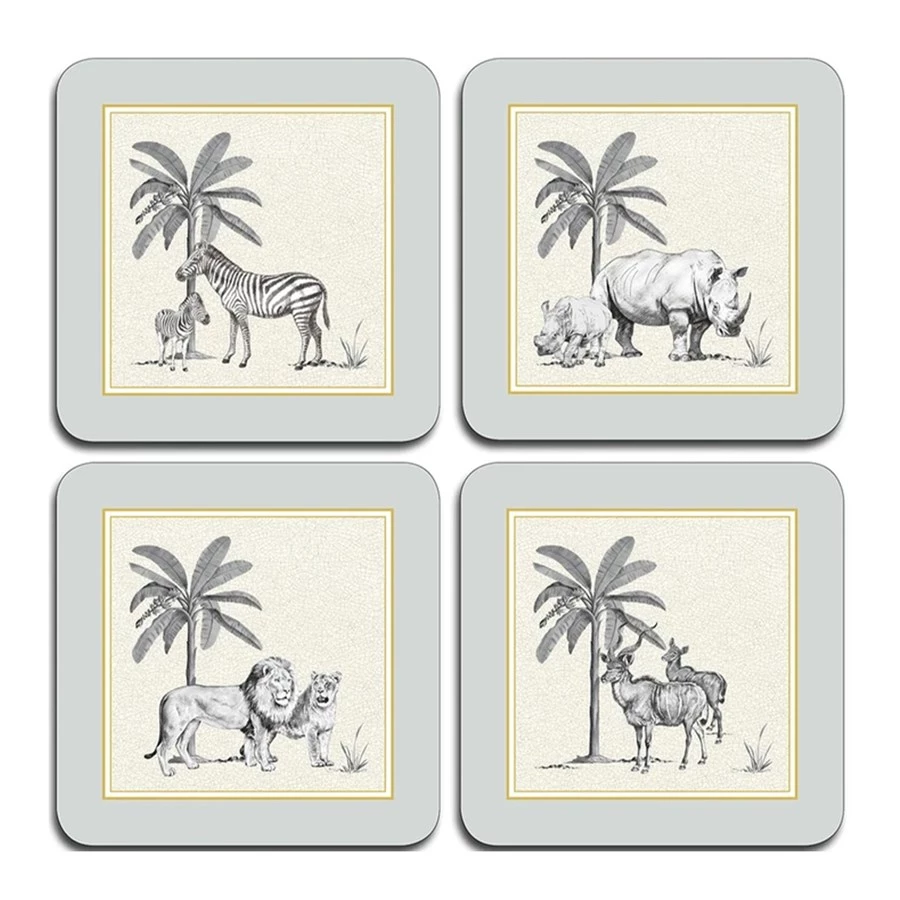 Grey border mats featuring safari animals in an elegant line pencil motif. Melamine mats are heat proof to 320 degrees Fahrenheit so can be used as trivets as well. Gloss finish with gold edges and a black base. Handmade in England. Exclusively at Scully & Scully.
