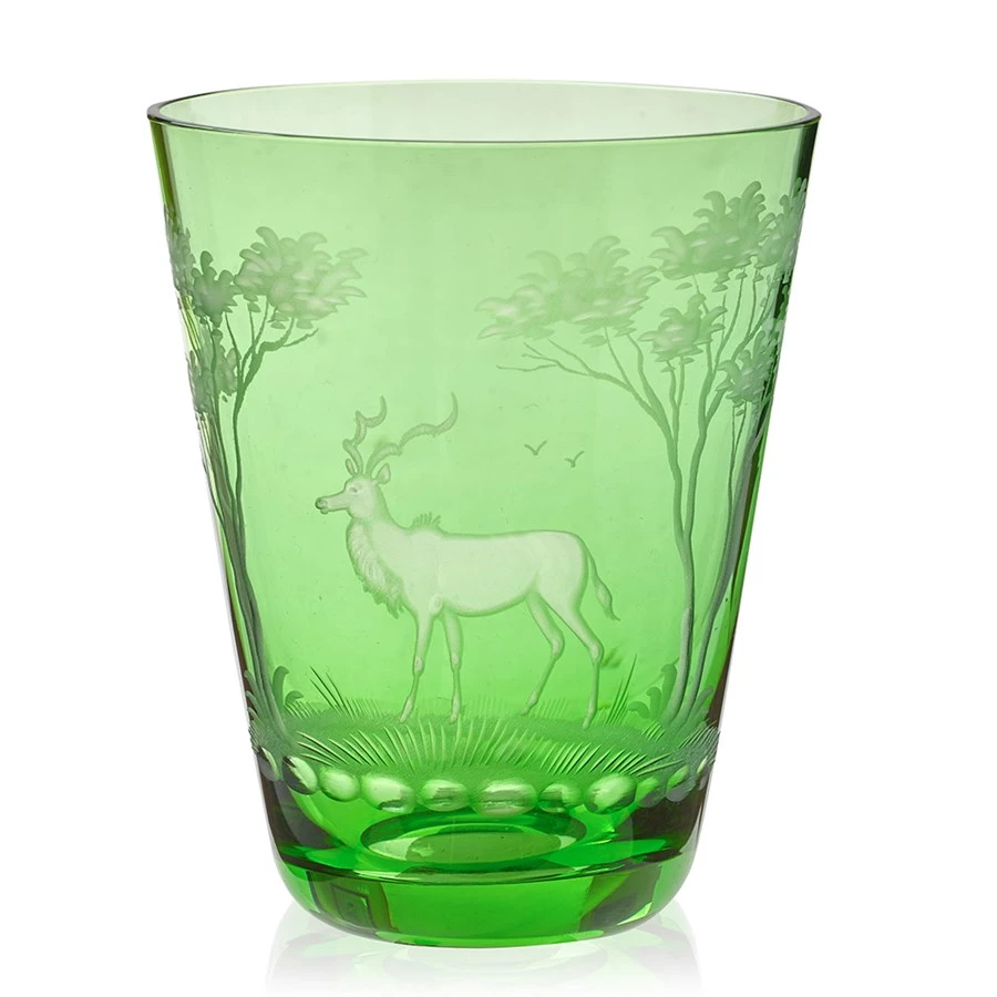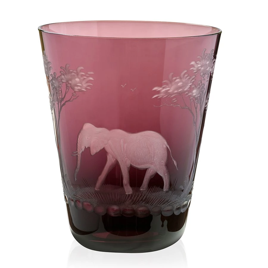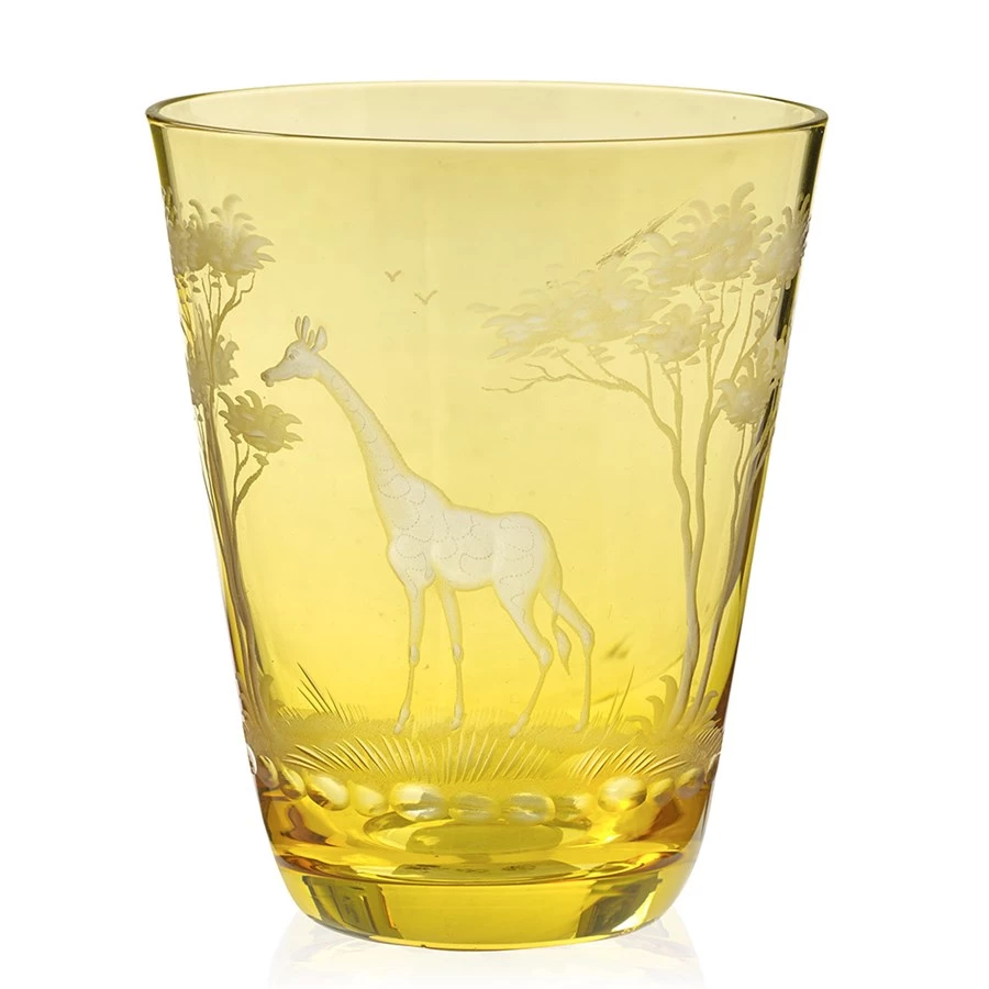 Mouthblown and handcut in the Bavarian region, each Kilimanjaro Tumbler is formed by overlapping colored crystal with clear beneath, resulting in stunning effect when the colored exterior is cut away. Each beautiful hue is handcut to reveal a proud animal from the Mount Kilimanjaro area of Tanzania. Handmade in Germany.
