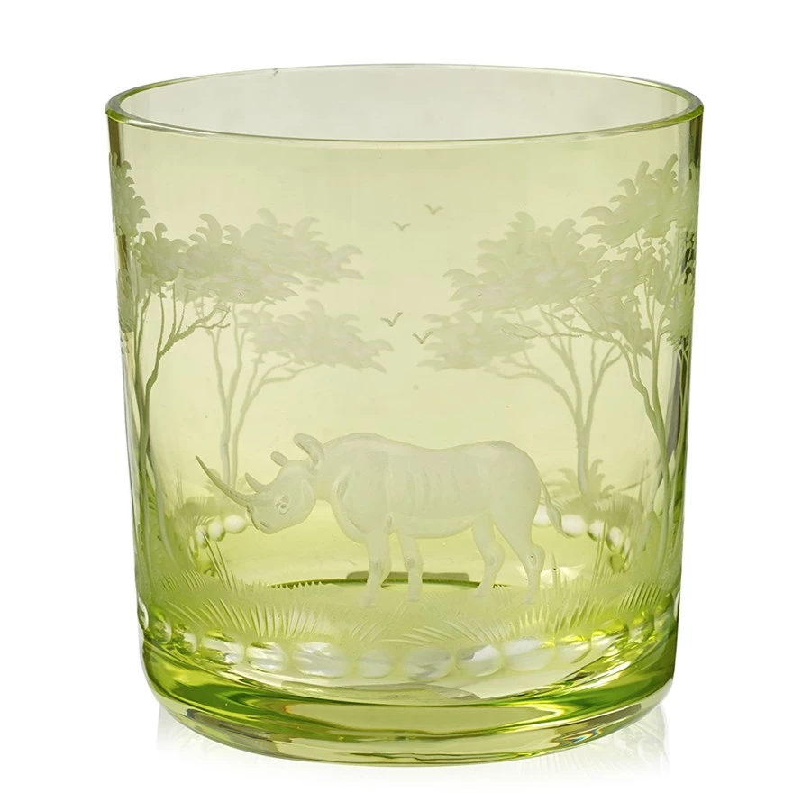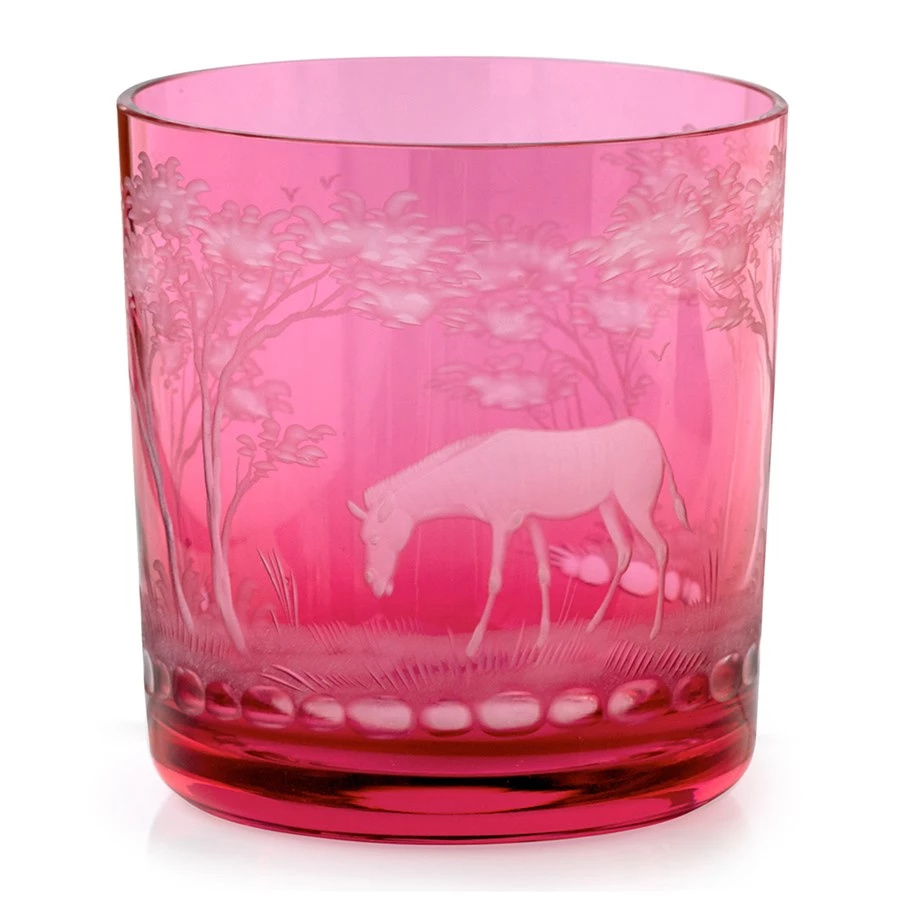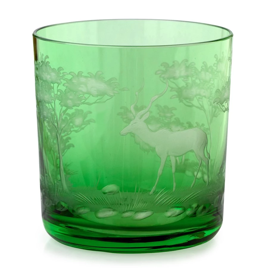 Mouthblown and handcut in the Bavarian region, each Kilimanjaro Whisky Tumbler is formed by overlapping colored crystal with clear beneath, resulting in stunning effect when the colored exterior is cut away. Each beautiful hue is handcut to reveal a proud animal from the Mount Kilimanjaro area of Tanzania. Handmade in Germany.