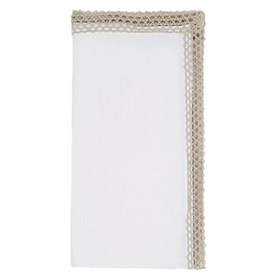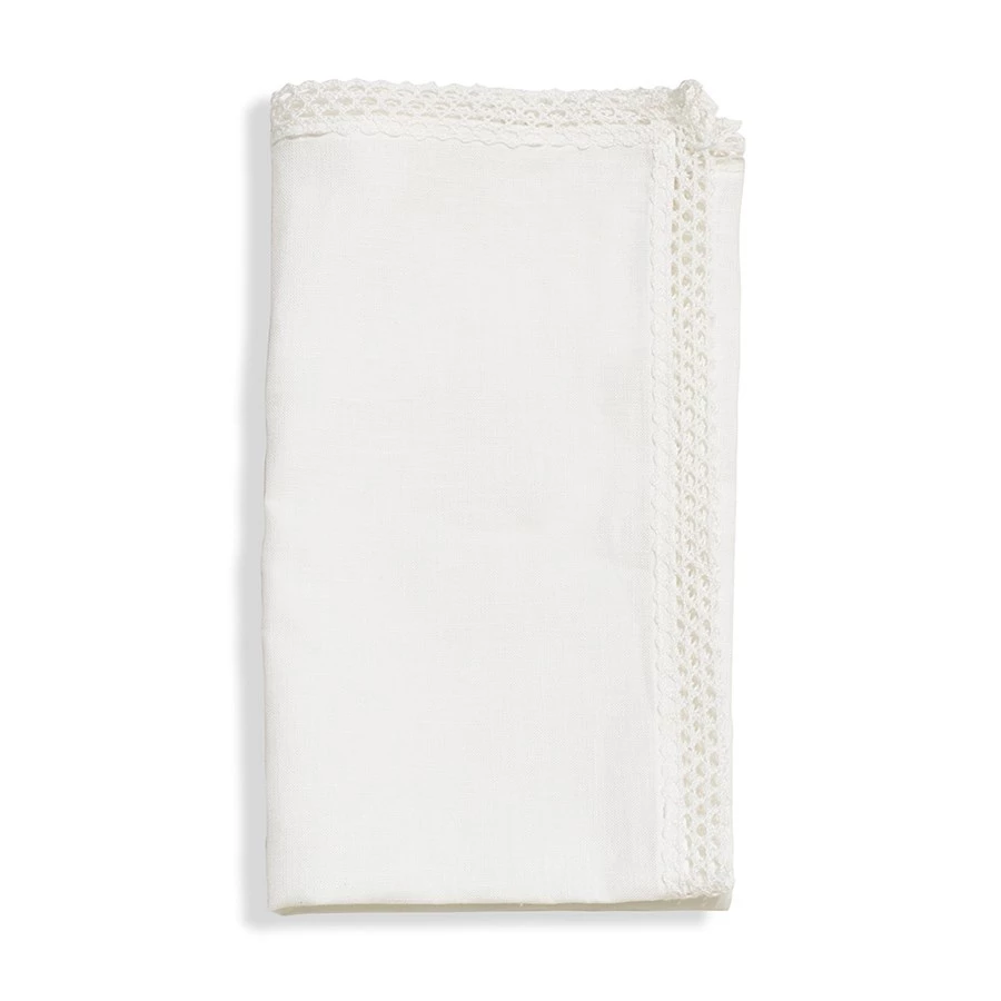 Casually elegant linen napkins are generously sized and feature a decorative open lace edge. Made in America.