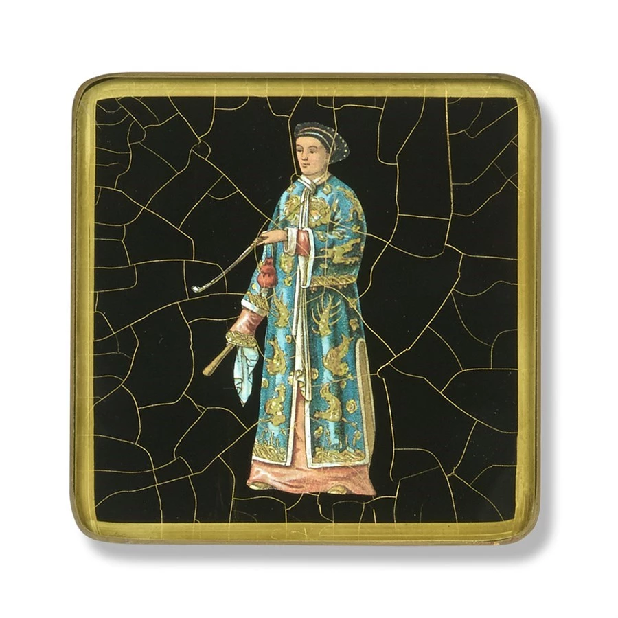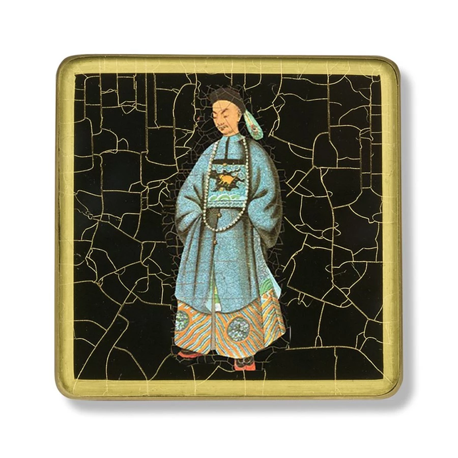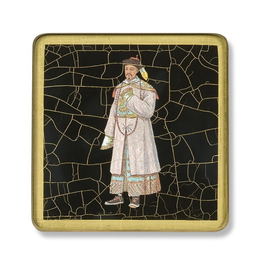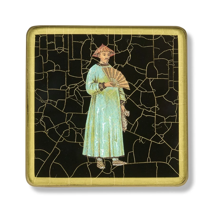 The traditional art of decoupage on square coasters handmade in England of glass with protective felt backing. Mats can hold warm plates. Exclusively at Scully & Scully.
