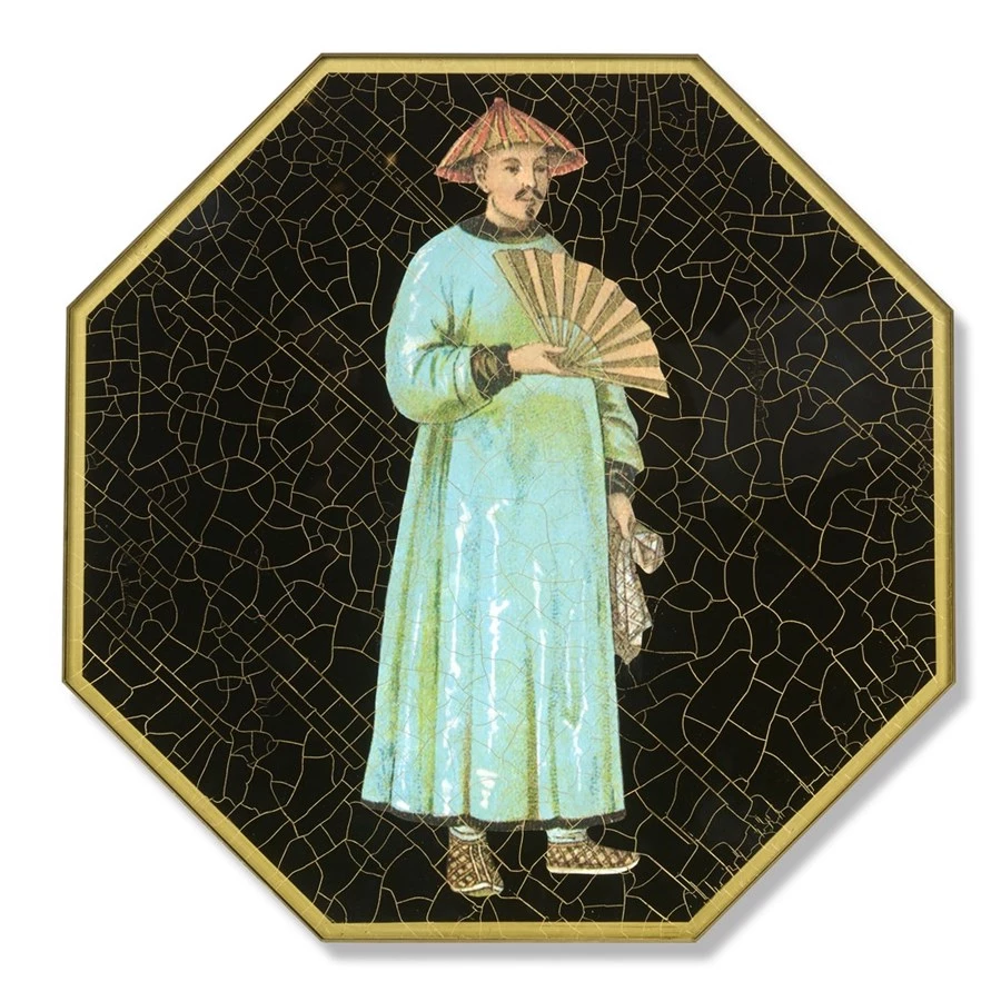 The traditional art of decoupage on octagonal small placemats handmade in England of glass with protective felt backing. Mats can hold warm plates. Exclusively at Scully & Scully.