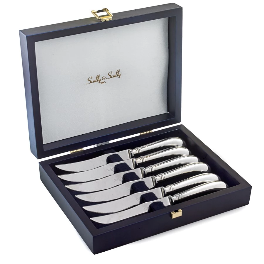A lovely and popular English design. Silverplate steak knives entirely handmade in England exclusively for Scully & Scully. Lined and fitted storage case.