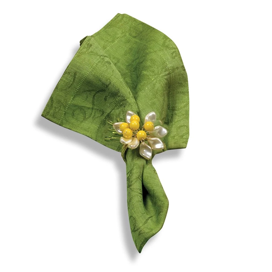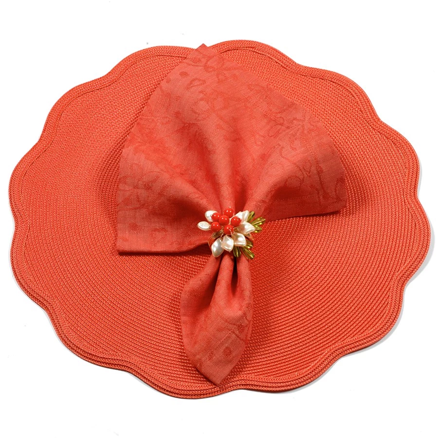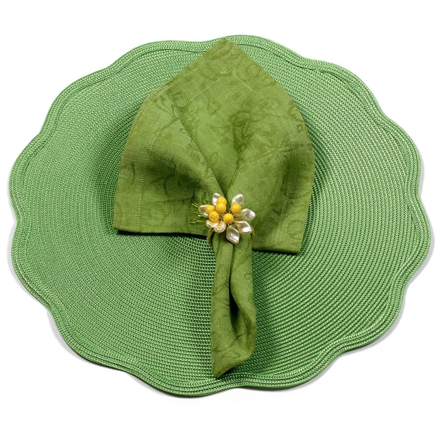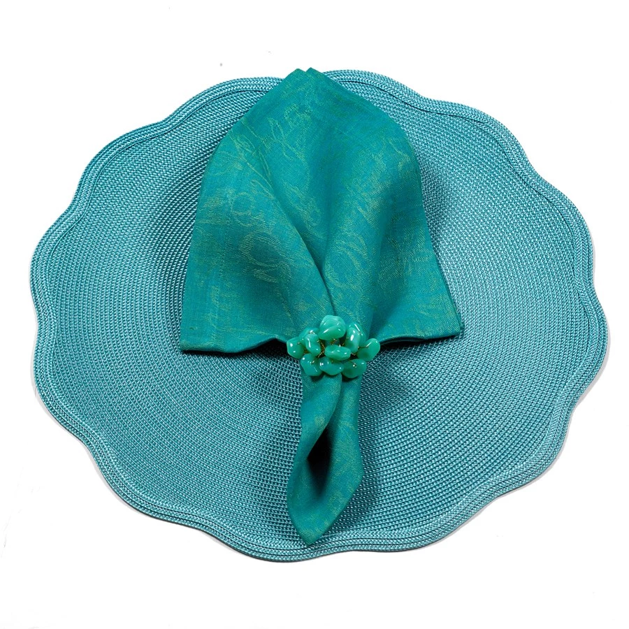 Elegant yet virtually indestructible! Handmade, braided scallop-bordered mats are unique, stylish and the ultimate in easy care — just wipe clean with a sponge. Add the napkin rings to make it a beautiful set.